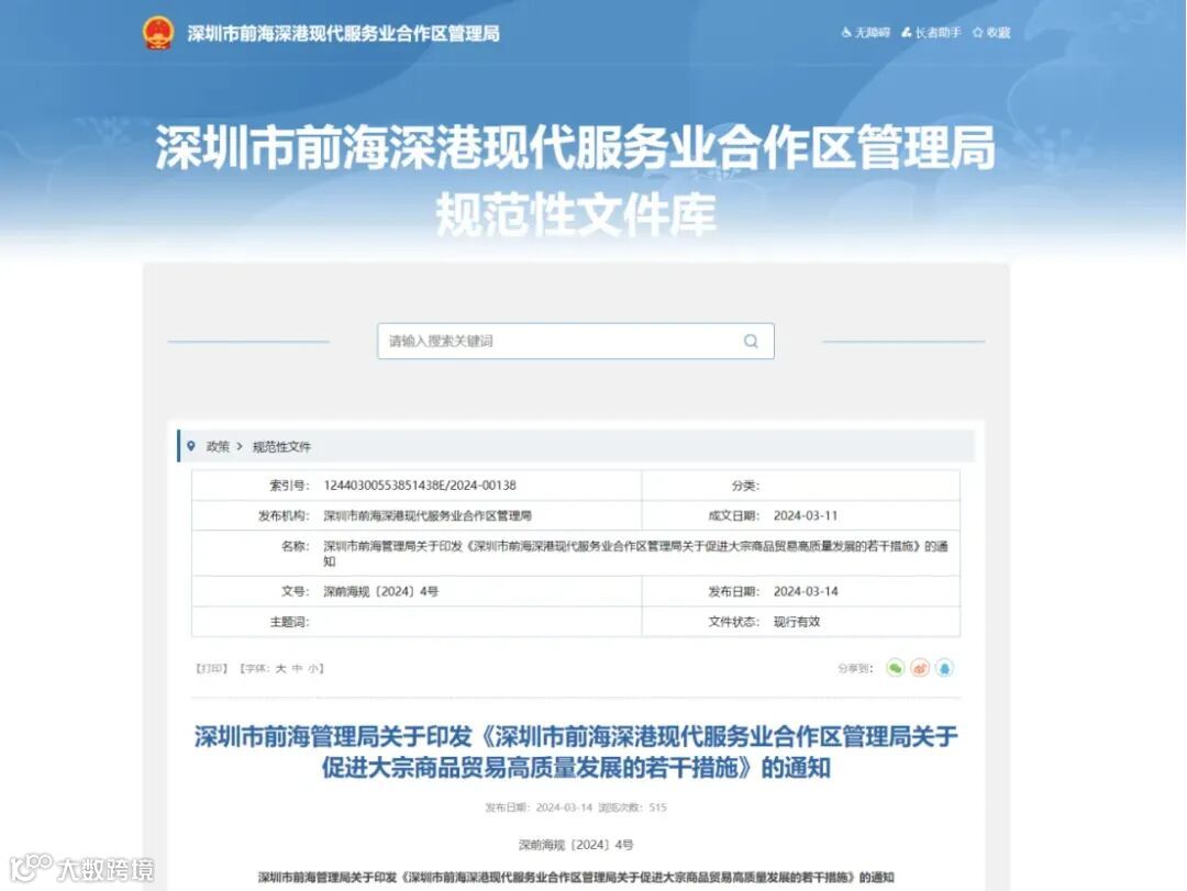 3月14日,深圳市前海管理局印发《深圳市前海深港现代服务业合作区管理局关于促进大宗商品贸易高质量发展的若干措施》