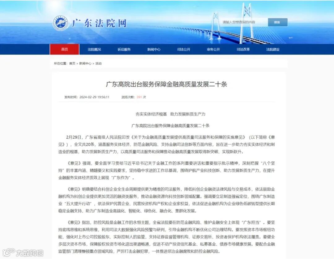 3月1日,广东省高级人民法院印发《关于为金融高质量发展提供高质量司法服务和保障的实施意见》
