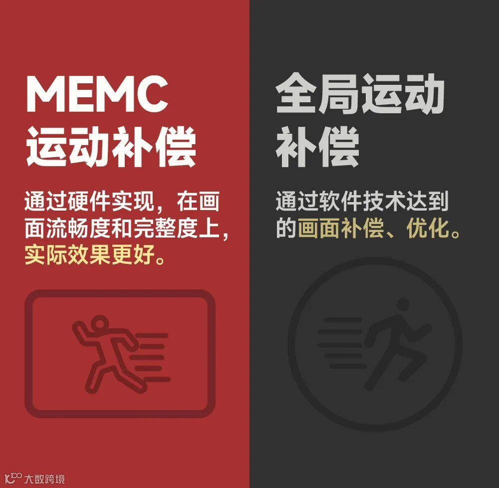 目前市场上的运动补偿有两种方式,一种是通过硬件实现的MEMC运动补偿,一种是通过软件技术来增加运动补偿功能。从实际效果来看,在画面流畅度和完整度上,MEMC运动补偿的效果要更好。
