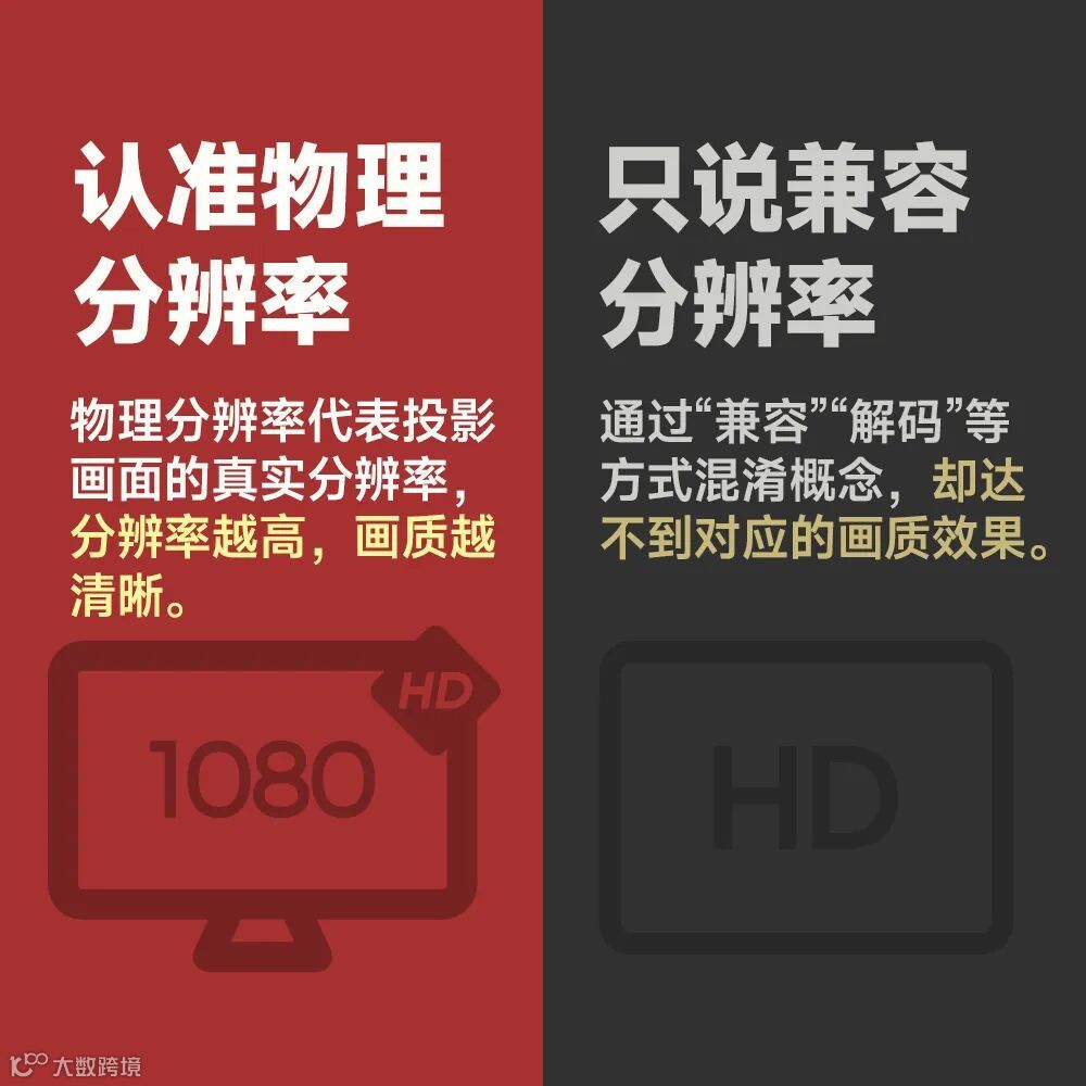 分辨率对于大部分人来说应该都不陌生,分辨率越高,画面更加清晰,能显示的细节更加丰富。商家在宣传中有时不会明确标明产品真实分辨率,而是通过“兼容1080P”“支持4K解码”等表达方式混淆概念。