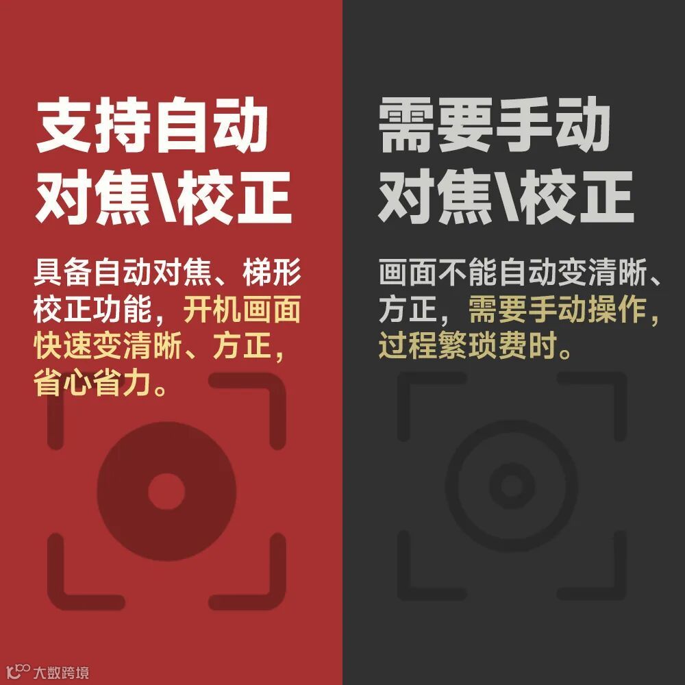 市面有些投影仪不支持左右梯形校正,那就无法实现侧投。能侧投的机型也仅仅支持手动梯形校正和对焦,使用起来麻烦不少,耗用更多时间和精力。