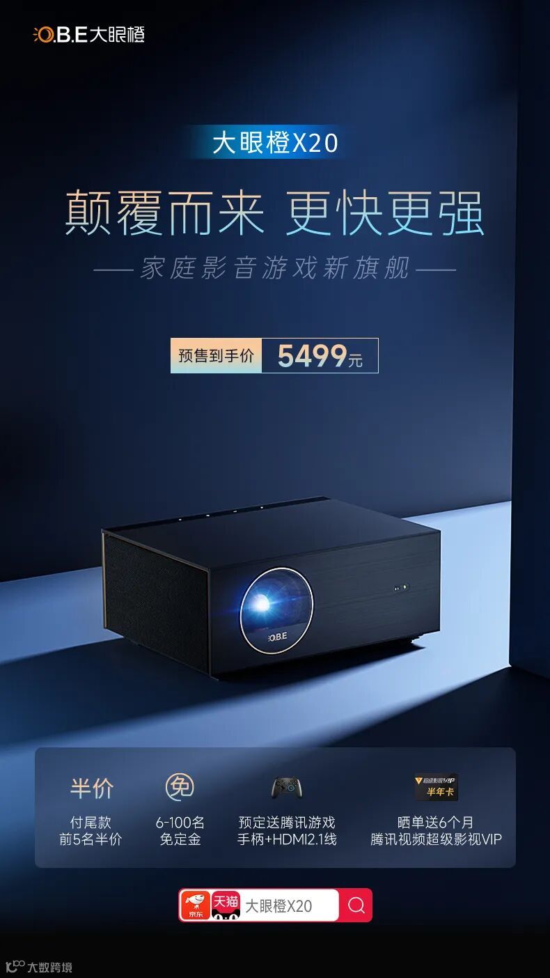 这样的旗舰投影X20你爱了吗?现大眼橙X20全平台预售即将结束,首发享24期免息,到手价5499元,前5名付尾款享半价,6~100名付尾款免定金,赠送腾讯云游戏手柄+HDMI2.1线,晒单还送6个月腾讯视频超级影视VIP!如此好价好福利,手快有,手慢无,速速店铺下单走起~