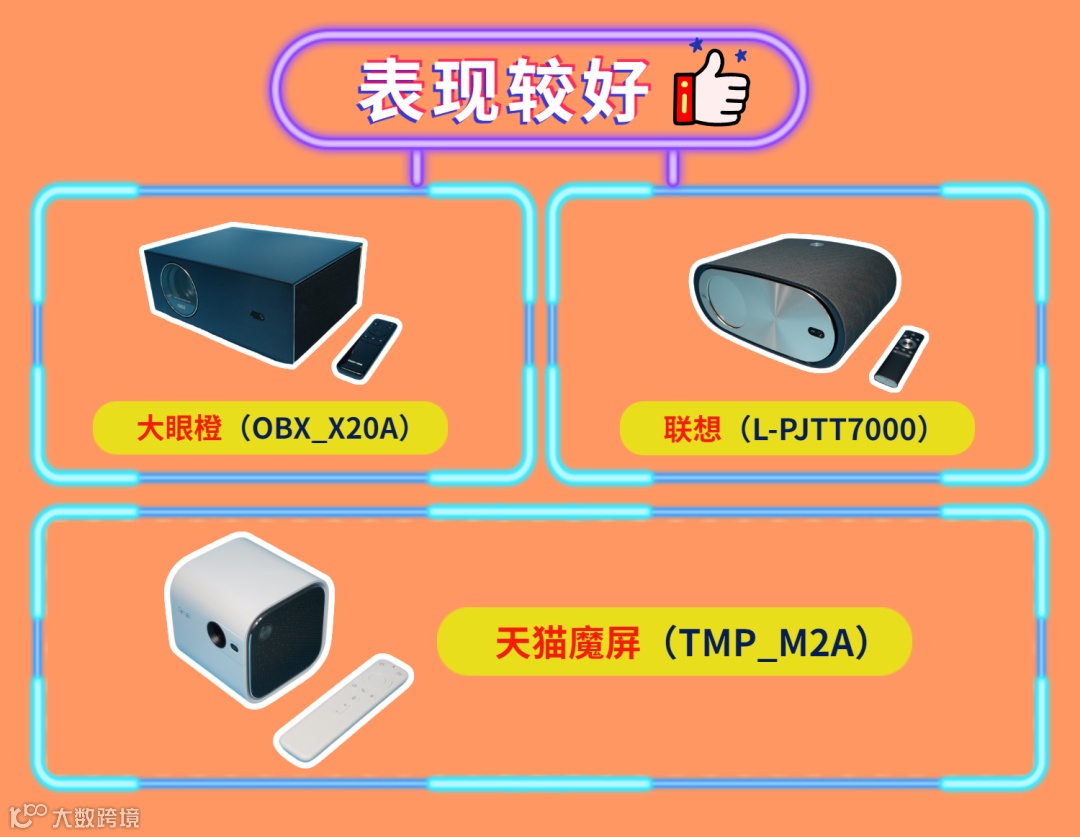 有3款投影机样品在这三项指标测试中综合表现表现较好,分别是:大眼橙、联想、天猫魔屏品牌样品。