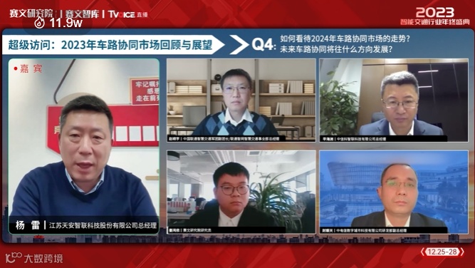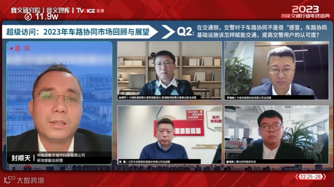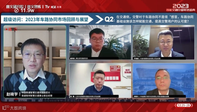 近日,在赛文交通网主办的2023中国智能交通行业年终盛典“超级访问:2023车路协同市场回顾与展望”中,赛文研究院研究员姜鸿依主持了“超级访问”环节。中信科智联科技有限公司总经理毕海洲、中国联通智慧交通军团副团长/联通智网智慧交通事业部总经理赵晓宇、江苏天安智联科技股份有限公司董事长杨雷、中电信数字城市科技有限公司研发部副总经理封顺天,四位嘉宾集中探讨了车路协同市场走势、应用场景等热点问题。