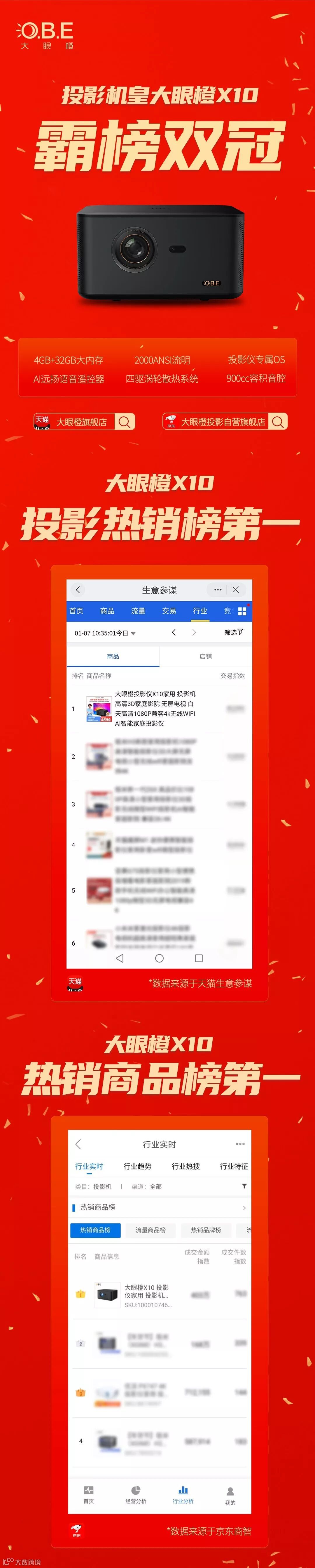 2020年1月7日凌晨起,智能投影机皇X10获投影热销榜第一、热销商品榜第一,荣获双冠、再创佳绩!