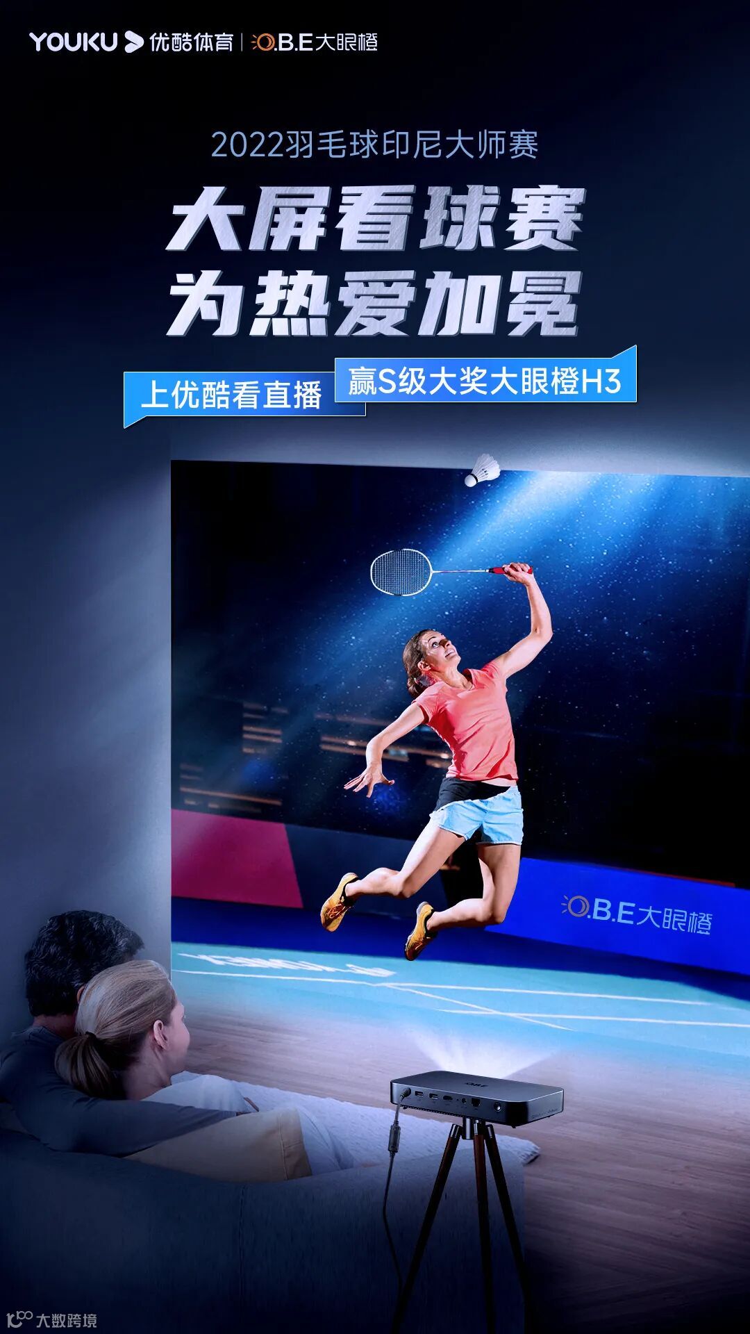 作为专注于智能投影制造的民族品牌,大眼橙一直关注国内羽毛球运动的发展,也始终致力于为广大运动迷提供更好的观赛设备。此次与优酷体育合作,大眼橙为广大用户提供了重磅观赛S级福利——大眼橙轻薄高亮投影H3。用户在观赛期间,通过参与互动、会员盲盒等方式,即有机会免费赢取产品大奖。