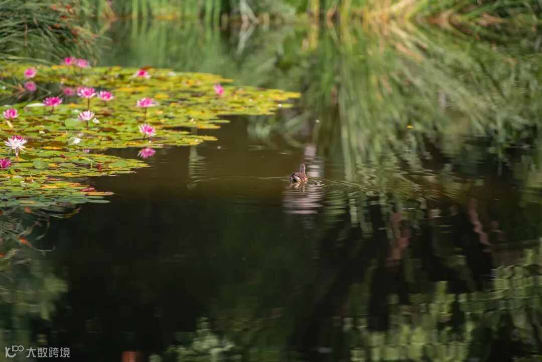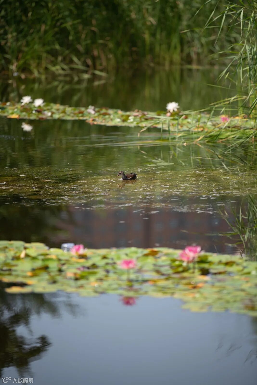 在泰丰公园可以看到,水光潋滟中,睡莲漂浮在水面上,优雅精致,其间还有数只黑水鸡在水池里肆意玩耍,伴随着湖畔轻柔的微风,令人顿感消夏。