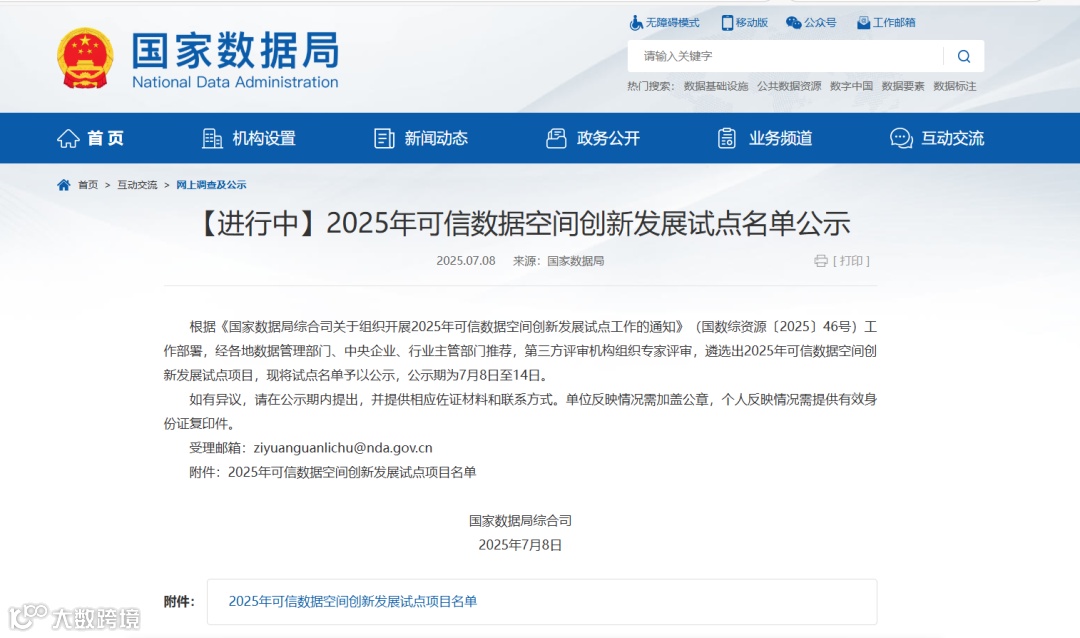 2025年7月8日,国家数据局发布《2025年可信数据空间创新发展试点名单公示》,旨在贯彻落实《国家数据局综合司关于组织开展2025年可信数据空间创新发展试点工作的通知》(国数综资源〔2025〕46号)精神,推动可信数据空间体系建设。