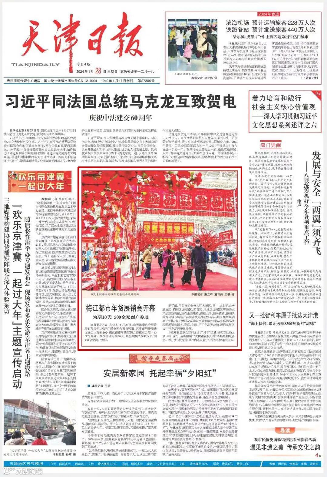 1月28日,《天津日报》头版报道了由泰达会展、天津广播电视台都市频道、天津市消费流通促进会主办的2024梅江都市年货展销会在梅江会展中心开幕,为广大市民群众在春节前提供一个集购物、休闲、娱乐于一体的狂欢盛宴。