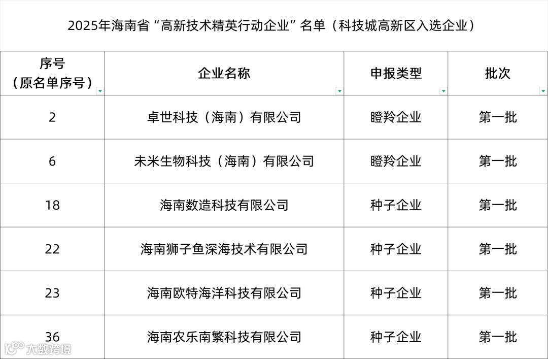 1月5日,海南省科学技术厅发布《关于认定2025年度海南省“高新技术精英行动企业”的通知》,全省共44家企业获得认定,构建起“种子企业-瞪羚企业-领军企业”的创新梯队。其中,三亚市六家企业成功入围,均为三亚崖州湾科技城高新区入园企业,约占全省认定总数的13.6%,彰显了科技城作为海南自贸港作为科技创新核心引擎的关键作用。值得关注的是,这六家企业的成功认定,离不开三亚科城产业发展与企业服务有限公司(以下简称“科城产服公司”)惠企政策服务专班的全程辅导与专业支持。