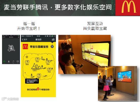 “我们在王府井餐厅里做了6个ibeacon,父母在用餐的时候,小朋友就可以拿着手机打开微信摇一摇在各个地方寻找宝藏的落点,他完成这个任务之后就可以获得一个奖品。用这样的一个方式让我们留住了这些客人,爸爸妈妈可以做自己的事情,小朋友也非常尽兴地在餐厅里面体验他的欢乐时光,”麦当劳高级总监冯莲介绍道,和微信的合作不止体现在自助点餐等支付环节,“我们想要服务,希望亲子时光能够更美好一点。”
