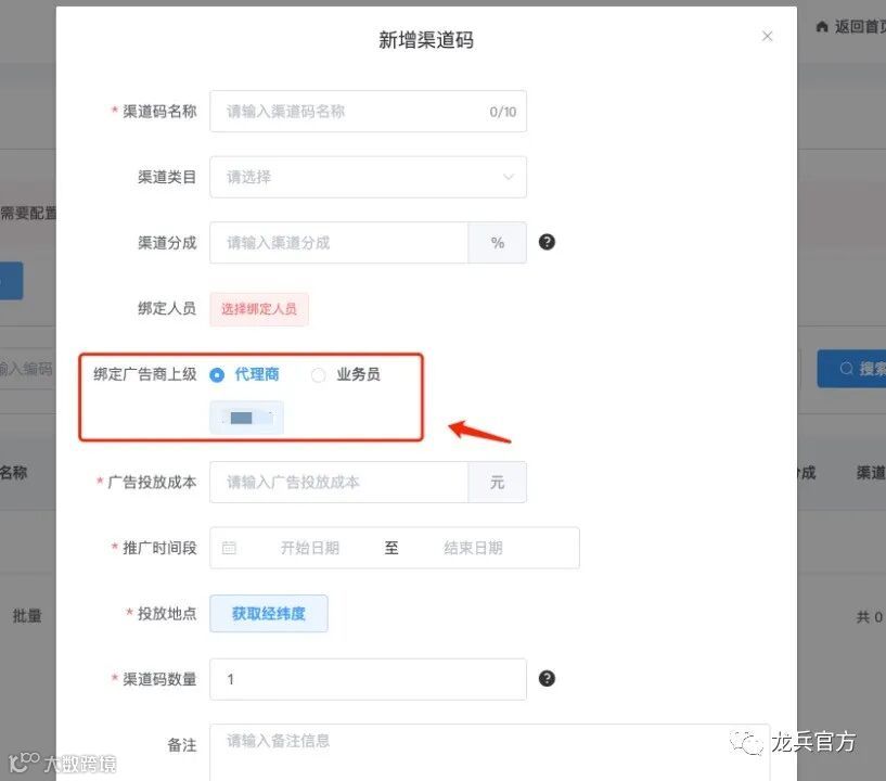 2、创建渠道码时,新增绑定上级