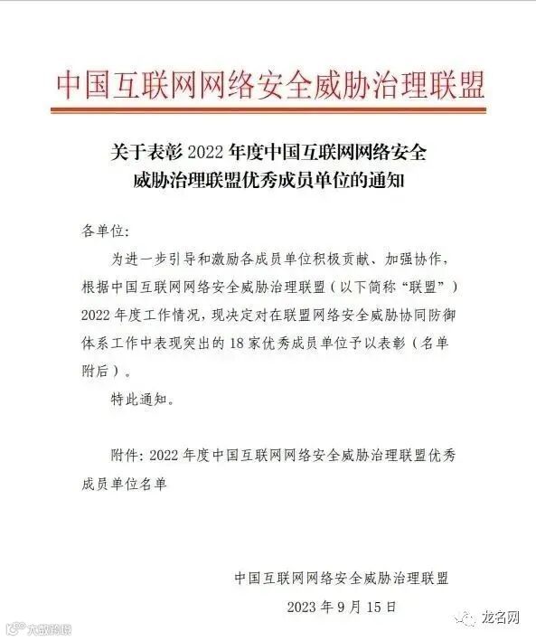此次获得“优秀成员”称号,既是中国互联网安全威胁治理联盟对龙名在网络安全工作中专业水平以及实力的认可,也是对龙名在网络安全领域所做出的努力和贡献的肯定。