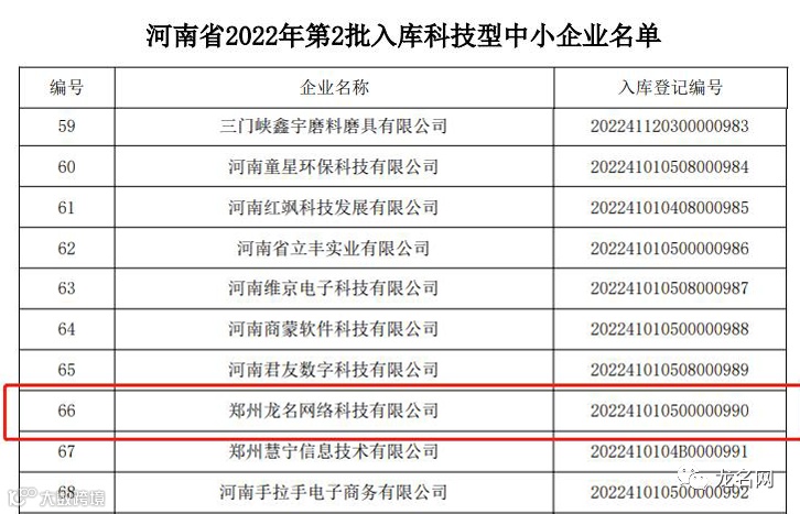 龙名网络入库河南省2022年第2批科技型中小企业