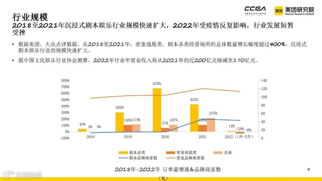 《报告》数据显示,从2018至2021年,密室逃脱类、剧本杀类经营场所的总体数量增长幅度超过400%,沉浸式剧本娱乐行业的规模快速扩大。2022年受疫情反复影响,行业发展略显受挫,据中国文化娱乐行业协会测算,2022年行业年营业收入将从2021年的近200亿元缩减至170亿元。