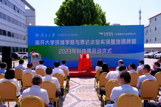 5月22日上午,天津泰达水业有限公司(以下简称:泰达水业)与南开大学环境科学与工程学院(以下简称:南开大学环境学院)实训基地揭牌暨泰达水业2023年科技周启动仪式成功举办。天津经开区科技局、南开大学环境学院、泰达实业相关负责同志受邀出席仪式,泰达水业领导班子成员及相关部门负责人参加。
