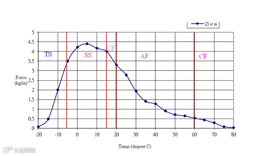 损耗角正切值(Tanδ)相当高,这表明胶黏剂在这个区域有较大的冷流倾向。G’在这个区域从玻璃态显着的骤降到橡胶态。胶黏剂在玻璃化转变区有较好的韧性。