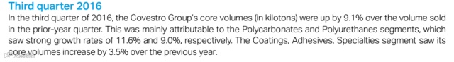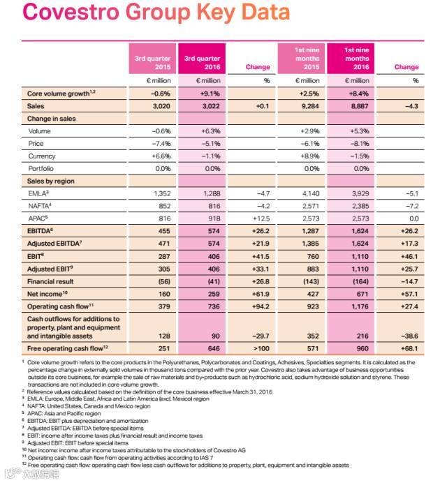 原因:该企业聚碳酸酯和聚氨酯产品销售占主要盈利部分。同时,由于销售价格的降低,胶黏剂涂料和特殊化学品部分销售量同比增长3.5%。