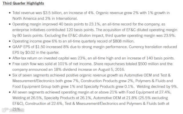 2016 Q3 季度主要业绩