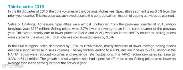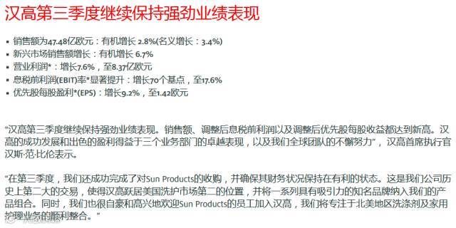 原因:第三季度完成了对美国公司Sun Products收购,新兴市场的成功开拓,使得有机销售额涨势强劲。其中,粘合剂技术业务部在第三季度取得了稳定的有机销售额增长,增幅为2.5%。