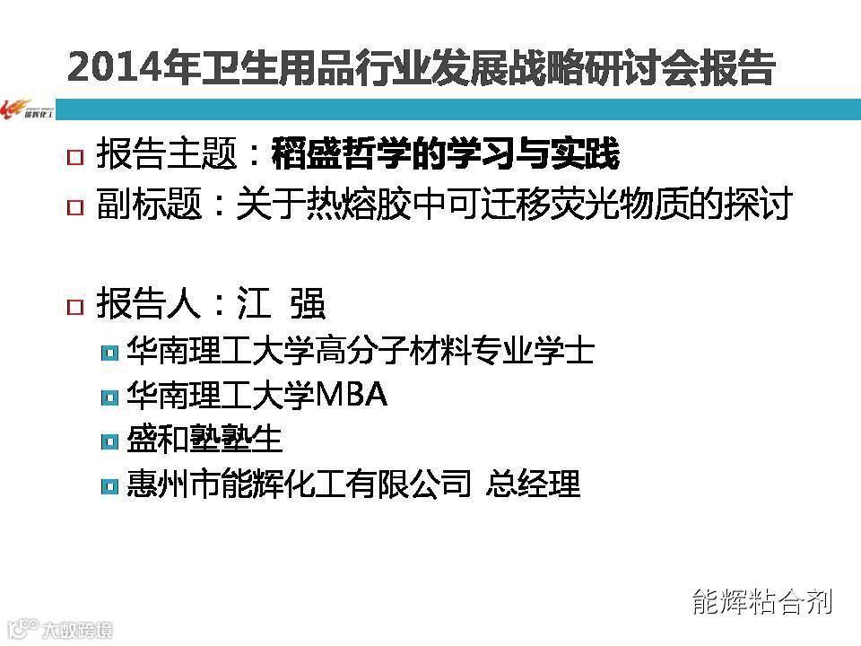 在此次会议中,惠州市能辉化工有限公司江强总经理以稻盛哲学的学习与实践为主题,结合热熔胶中可迁移性荧光增白物质的探讨做了专题报告。报告PPT分享如下: