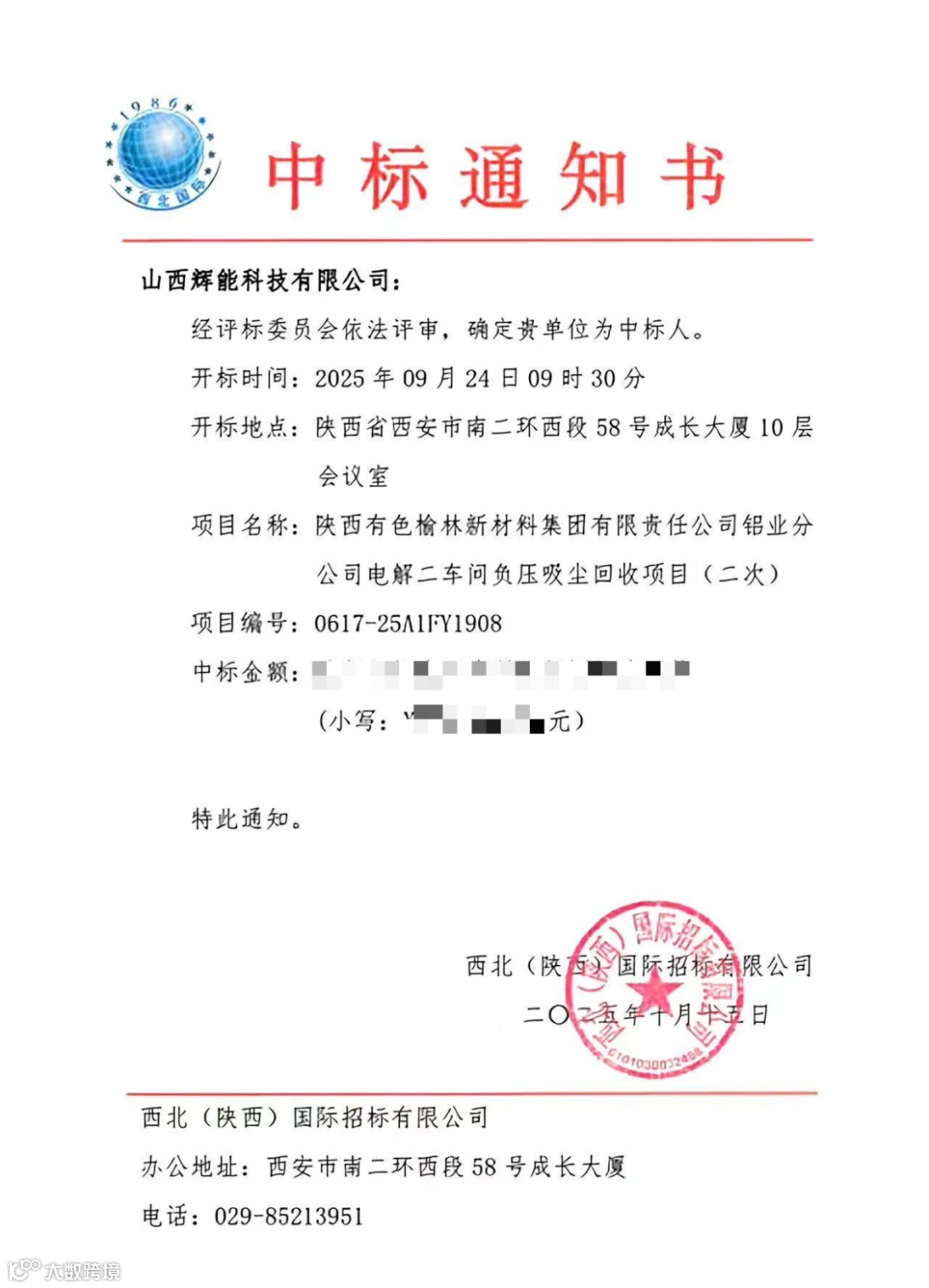 近期,山西辉能科技接连斩获中标喜讯。在陕西有色金属榆林新材料超低排放粉尘治理项目的激烈角逐中,凭借卓越的过往业绩、深厚的技术沉淀,以及广受认可的市场信誉,从一众竞争对手中强势突围,成功中标。