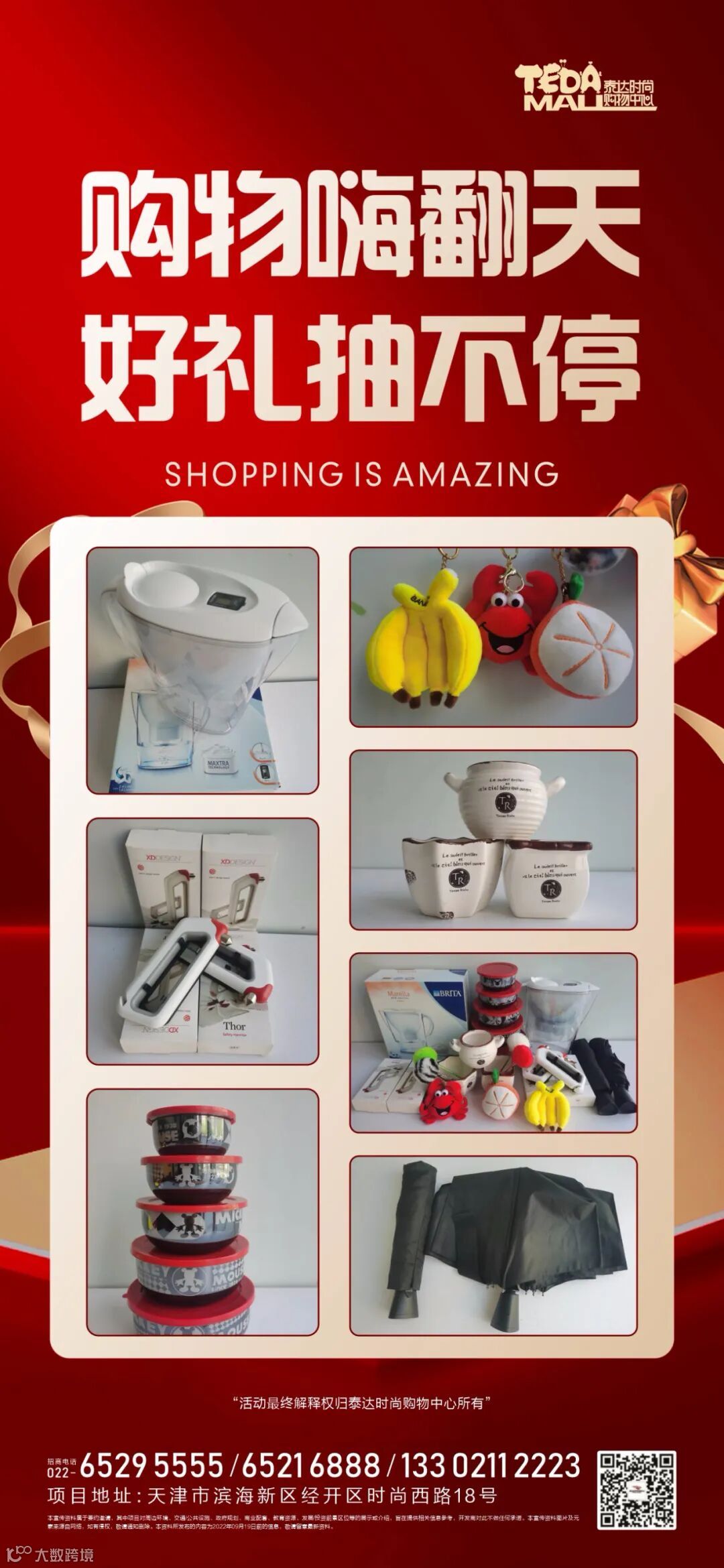 点击文末“阅读全文”,转发信息至朋友圈,凭泰达时尚购物中心商家任意金额消费凭证,即可赢得抽奖机会,让你不虚此行~
