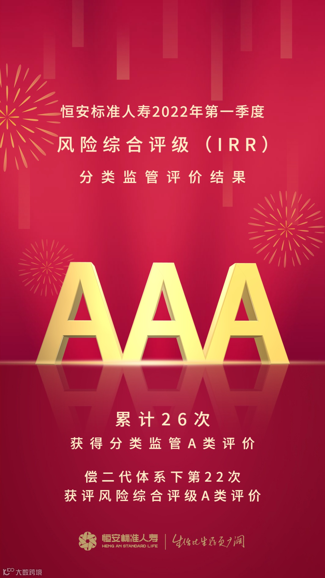 近日,中国银保监会发布2022年第一季度风险综合评级(分类监管)评价结果,泰达控股所属恒安标准人寿荣获AAA类最高等级评价,充分体现出业界对恒安标准人寿稳健经营的实力认同。