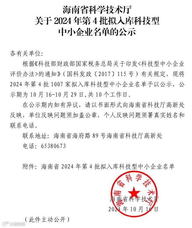 近日,海南省科学技术厅公示了海南省2024年第4批拟入库科技型中小企业名单,三亚崖州湾科技城控股集团有限公司下属三亚崖州湾科技城创新发展中心有限公司和三亚崖州湾数字科信有限公司通过层层审核,荣获国家级科技型中小企业荣誉资质。