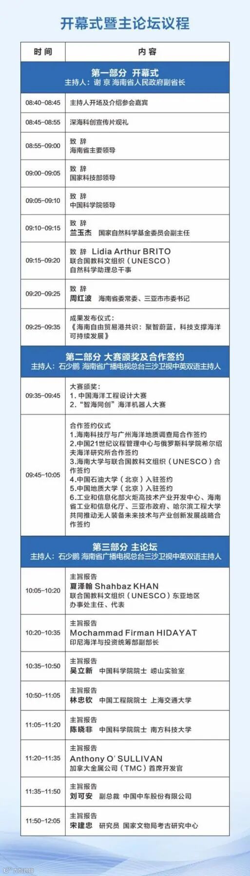大会由海南省人民政府、中华人民共和国科学技术部、中国科学院、国家自然科学基金委员会指导,海南省科学技术厅、中国21世纪议程管理中心、三亚市人民政府、联合国教科文组织(UNESCO)、海南省海洋厅联合主办。2023年10月,首届海南自贸港国际科技创新合作论坛暨深海技术创新大会同样在深海科创平台举办,并取得圆满成功。据了解,本届论坛相较于首届,论坛内容更加丰富,设有开幕式暨主论坛、9场平行专题论坛和5场活动,分论坛和配套活动的数量均实现成倍增长。大会以“聚智深海,共享蔚蓝”为主题,旨在通过高水平打造深海国际科技与创新合作的交流平台,构建高水平的国际交流合作生态圈,持续打造国际化的论坛品牌。