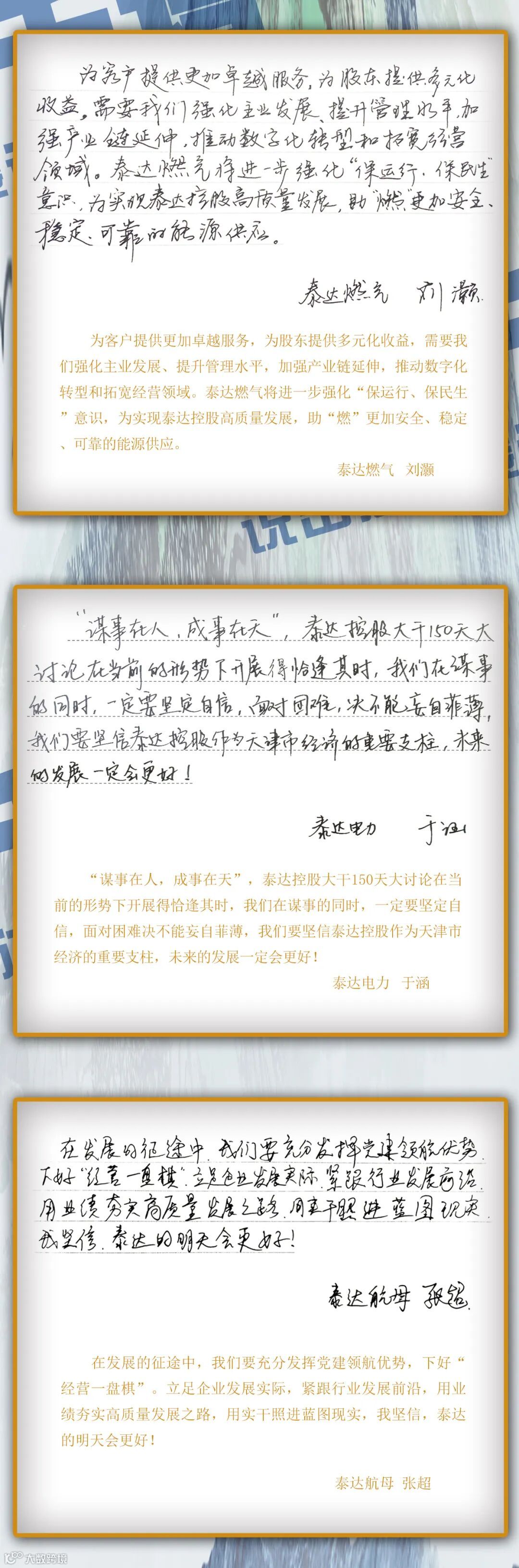 “解放思想聚合力、真抓实干转作风、全力以赴推动泰达控股高质量发展”大讨论暨大干150天活动,吹响了砥砺奋进、攻坚克难,全力以赴推动高质量发展的“集结号”。全体泰达人正积极投身高质量发展的火热实践,以朝气蓬勃的热情、激情,舍我其谁的闯劲、干劲,冲锋在改革发展主战场,奋战在重大项目主阵地,坚守在服务民生最前沿。大家怀揣对泰达的炽热情怀,饱含对高质量发展的无限期许,纷纷写下“对泰达想说的话”,汇聚成了为改革发展建言献策的奋进诗篇。让我们透过真情流露的“千人千语”,聆听泰达人坚定而热切的心声。