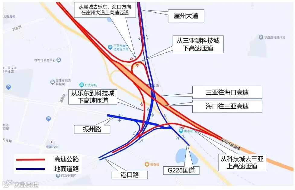 随着高速匝道陆续开通,地面道路通行也在有序放开。本次放开的地面道路分别是港口路-崖州大道、振州路-G225国道,均为双向6车道,在匝道口位置收窄为4车道,行驶地面道路的车辆可在港口路-崖州大道、振州路-G225国道十字路口进行转弯,从G225国道往崖州大道方向行驶车辆可沿老路继续通行。