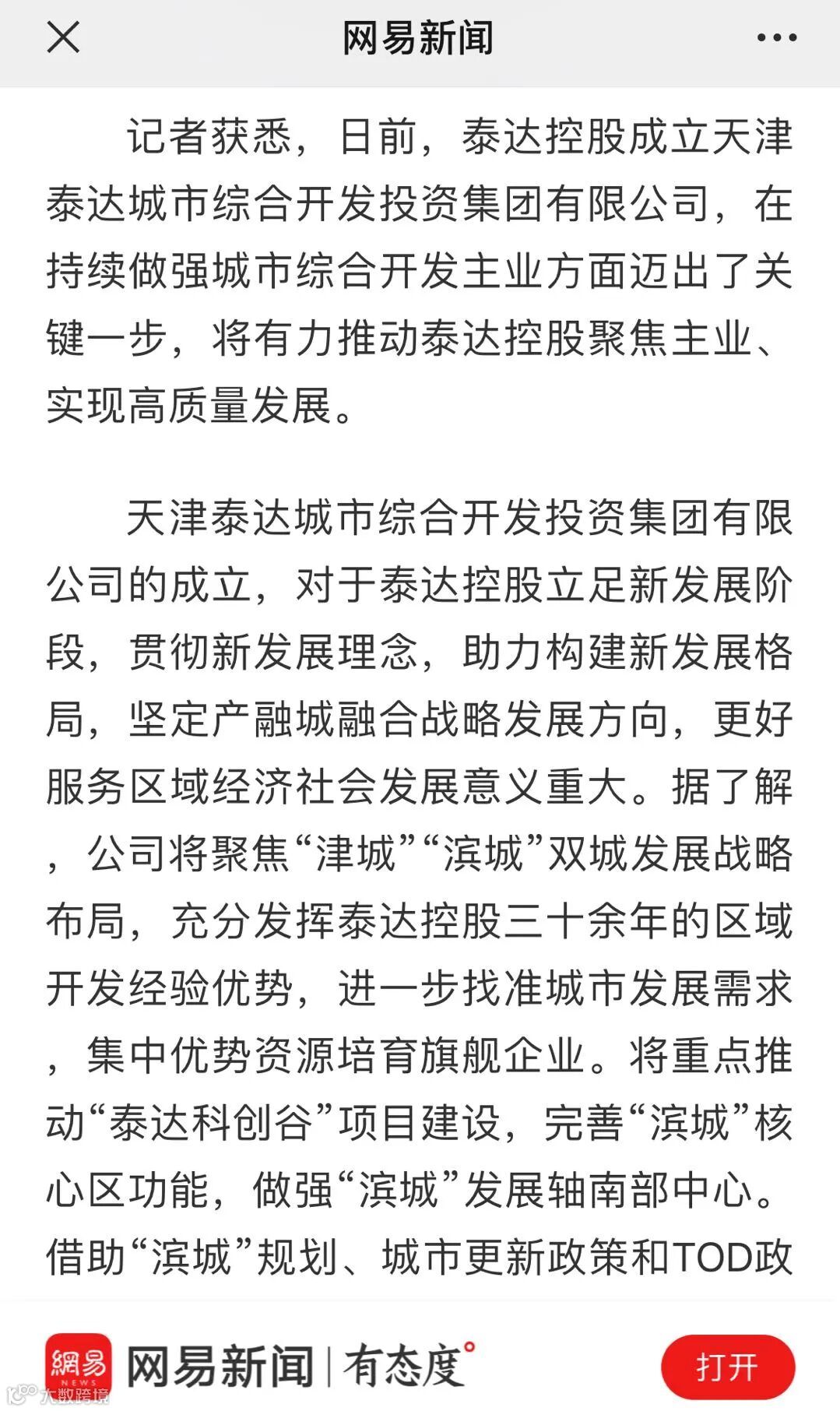 记者获悉,日前,泰达控股成立天津泰达城市综合开发投资集团有限公司,在持续做强城市综合开发主业方面迈出了关键一步,将有力推动泰达控股聚焦主业、实现高质量发展。
