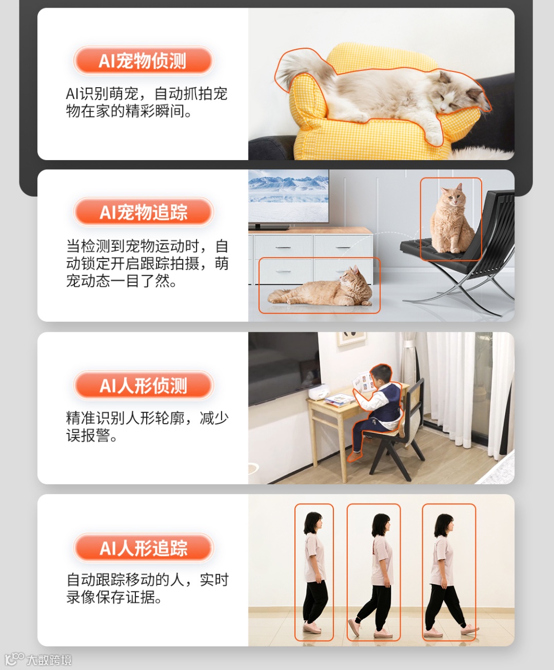 AI宠物侦测、AI宠物追踪、AI人形侦测、AI移动侦测、AI人形追踪等五项本地AI能力,本地AI相较于云端AI,识别更快延时更短,可以更早将报警发送到用户手机上,及时发现并解决异常情况。