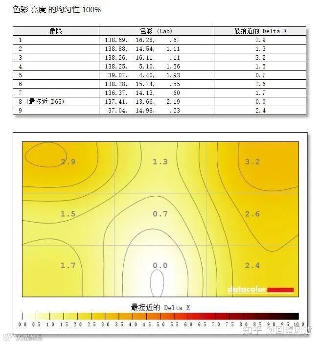 在色彩亮度均匀性测试中,AGON AG275QXPD象限5、8为0.7和0,二者的表现最接近D65,而象限1、3、6、9差异最大,但最大差异值仅为3.2,色彩亮度均匀性表现出色。