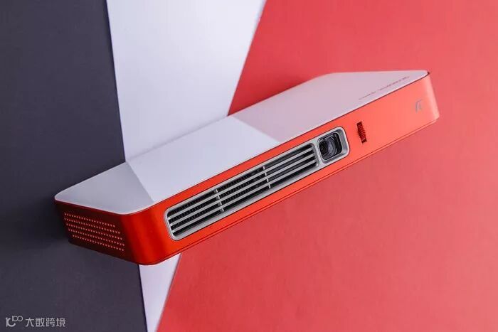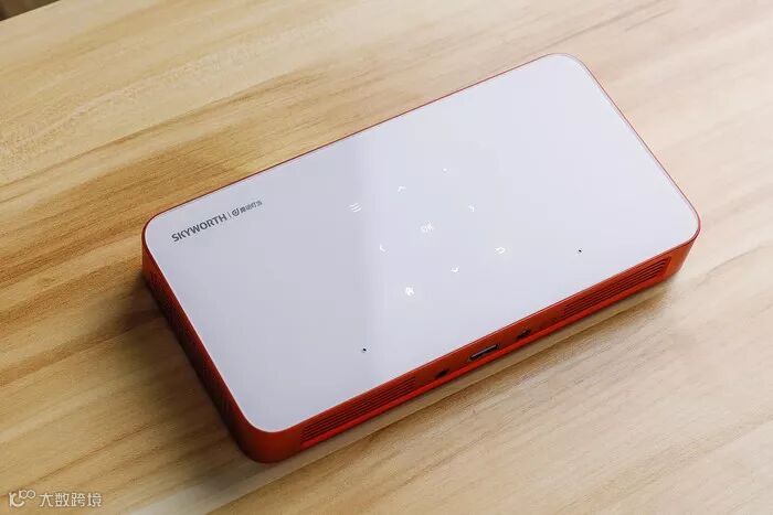 主机侧边均为红色配色,正面依次为出风散热口、投影镜头和调焦键。投影镜头使用的是高透光玻璃镀膜,相对于一些廉价的树脂镜头,玻璃镀膜镜头不易产生跑焦和虚焦的情况。玻璃的摩氏硬度在5-6级,表面不易被刮花,这对于经常需要外出携带的便携投影仪而言,是非常实用的。