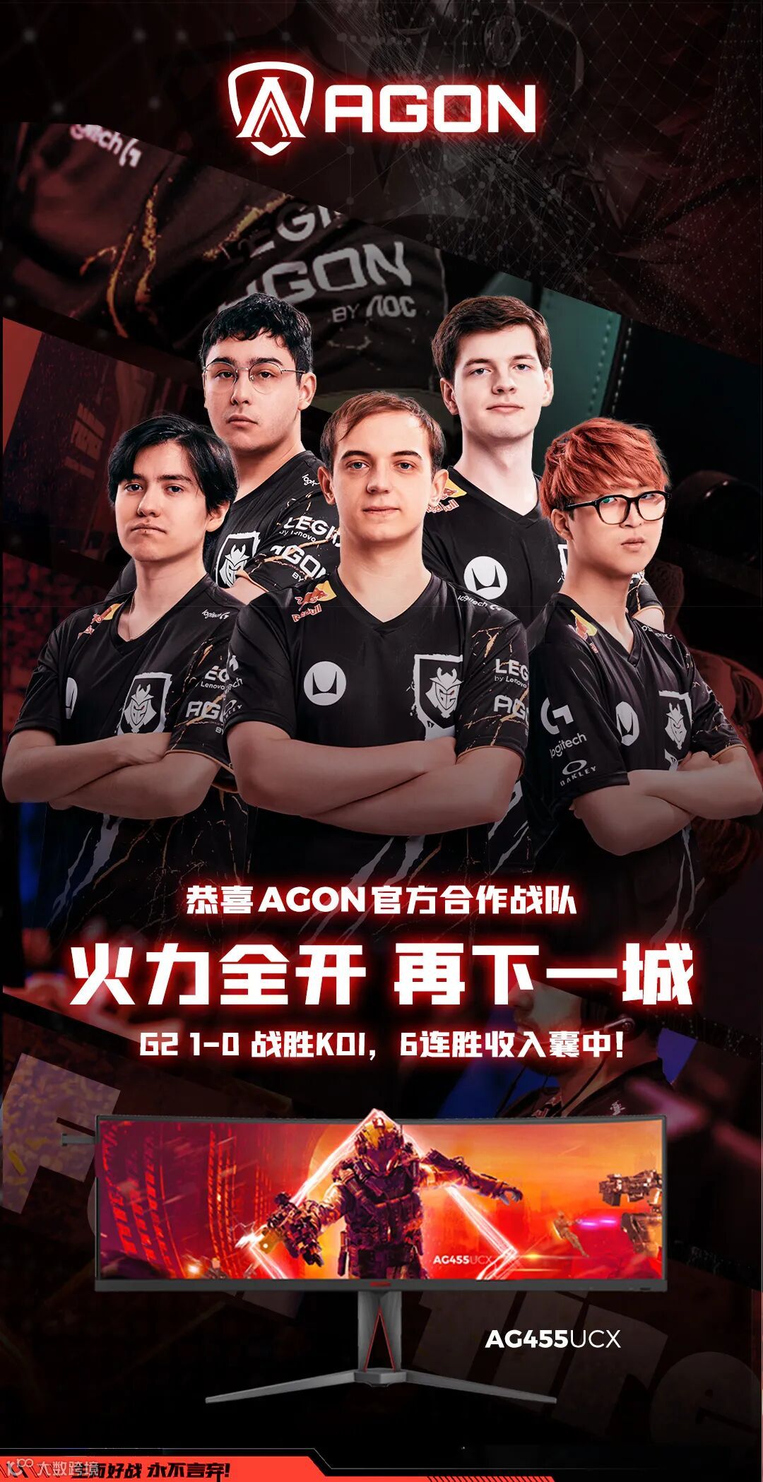 2023年7月3日,LEC夏季赛上演了一场激动人心的精彩对决,AGON爱攻官方合作战队G2 1-0战胜KOI战队,创造出“六连胜”的纪录!在整场比赛中,G2战队凭借出色的战术意识以及默契的团队配合,一次次改变对局的走向,令对手“防不胜防”,成功击碎KOI战队最后的防线,为队伍争取了宝贵的胜利。