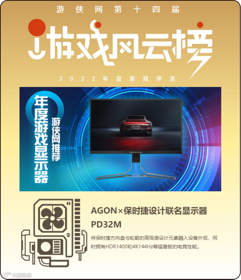 此次经过层层筛选、详细测评和仔细商谈,最终AGON爱攻×保时捷设计联名Mini LED显示器PD32M凭借优秀的性能与潮流的外观设计被评选为2022年度游侠网推荐显示器。