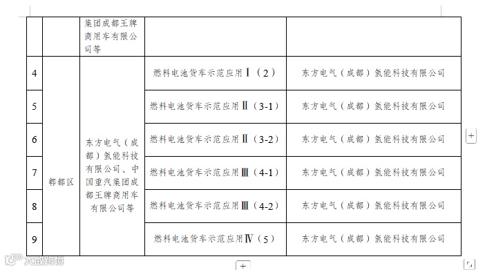 根据项目名单,拟支持示范应用项目有9个,牵头单位为四川荣创新能动力系统有限公司、成都新研氢能源科技有限公司、东方电气(成都)氢能科技有限公司。