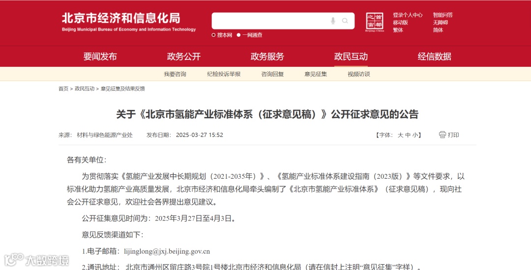 为贯彻落实《氢能产业发展中长期规划(2021-2035年)》、《氢能产业标准体系建设指南(2023版)》等文件要求,以标准化助力氢能产业高质量发展,北京市经济和信息化局牵头编制了《北京市氢能产业标准体系》(征求意见稿),现向社会公开征求意见,欢迎社会各界提出意见建议。