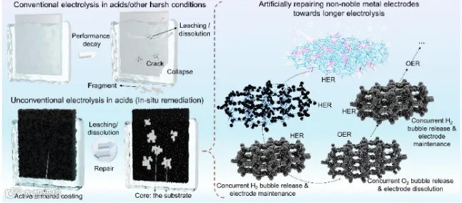 解决了阴极沉淀,海水直接电解还面临海水中氯离子侵蚀阳极、引发大量副反应导致的阳极催化效率低、稳定性差的困扰。针对这一难题,团队发展了C2O42−到CO32−的原位碳氧阴离子自转化(COST)策略,有效保护活性位点免受碱性海水氧化过程中Cl−侵蚀,实现长久、安培级碱性海水电解(Angew. Chem. Int. Ed., 2024, 63, e202316522);通过构筑高分散的微结构铬氧化物和铬阴离子稳定NiFe位点,利用均匀分布的OH?富集中心和抗Cl−吸附中心,从根本上提高了NiFe基电极碱性海水OER的活性、选择性和化学稳定性,实现了安培级电流密度下稳定电解海水2500h。(Nat. Commun., 2024, 15, 6624)。团队还提出电极保护外层策略来提高镍电极在苛刻条件下的使用寿命,使其在低pH溶液中以安培级电流密度进行交替电解长达93.8小时,使用寿命是传统水电解系统中镍电极的47倍。该工作有效证明了通过有效、重复的沉积-溶解过程在工程化苛刻电解条件进行长时间电解的可能性(Nat. Commun., 2024, 15, 6208)。