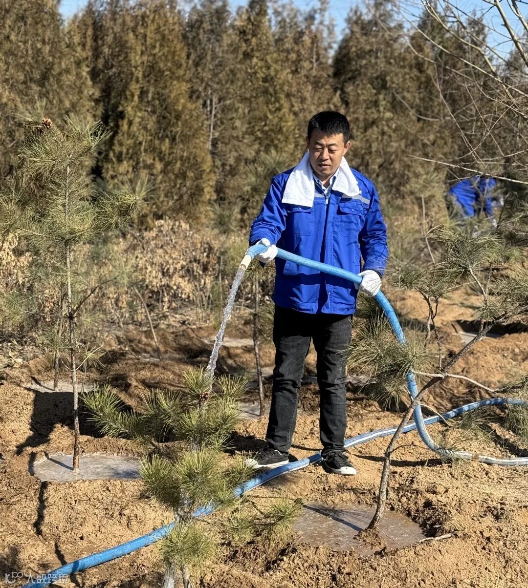 在庄子乡北赵村东庄头的油松林旁的荒地,大家提着水桶、拿着铁锨,按照分工与安排纷纷忙碌起来。“你来把小树苗扶正,我来培土压实……”植树现场,大家一边互相默契地配合着,一边交流着种植果树树苗的看法,挥锹铲土、踏土种苗、拎管提桶浇水,每个步骤都一丝不苟,整个流程井然有序,一派热火朝天的景象。