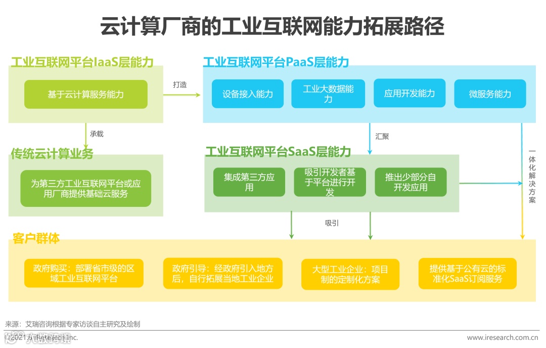 任何工业互联网平台的运行都需要云计算作为底层基础设施进行支撑,这也给云计算厂商在发展工业互联网业务时带来了一个得天独厚的优势。云计算厂商充分利用自身传统资源优势,在过硬的IaaS层能力上打造自身工业互联网平台的PaaS层,通过完善和提升PaaS层能力为与第三方应用开发厂商的合作奠定基础,并吸引更多的独立开发者基于平台能力进行应用开发,以期望能够为平台源源不断地汇聚SaaS层能力,进而形成自身成熟的工业互联网生态。
