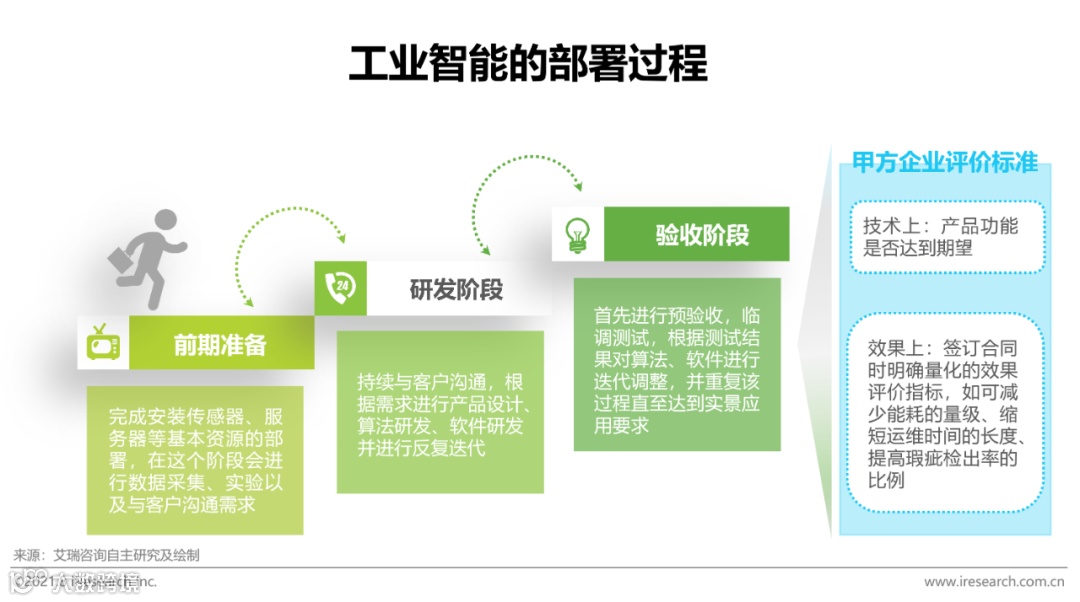 当前人工智能主要通过三种模式融入工业互联网。第一,直接将AI算法或模型嵌入工业互联网平台层,以提升平台层数据分析能力;第二,提供工业AI软件系统,并通过云端部署形成标准化的工业互联网SaaS层应用;第三,提供一套工业互联网框架下包含软件和边缘侧硬件的完整系统。部署过程中会根据行业类别、产品相似度、场景条件、问题共性等因素对不同AI模型进行组合,对同一个行业来说,针对同一个环节将模型尽量标准化以实现移植应用。现阶段工业智能应用以平台侧为主,后期会向边缘侧发展,边缘侧的实时性要求需要AI模型产出的结论与产线或者设备形成控制闭环,艾瑞认为目前我国工业企业自动化程度不一,现场数据质量不高,并且企业对于人工智能的应用较为保守,时下落地较多的应用无论是安全监管还是质量检测都主要集中于平台侧,边缘侧工业智能的下一阶段发展需要配套基础设施和能力的共建。