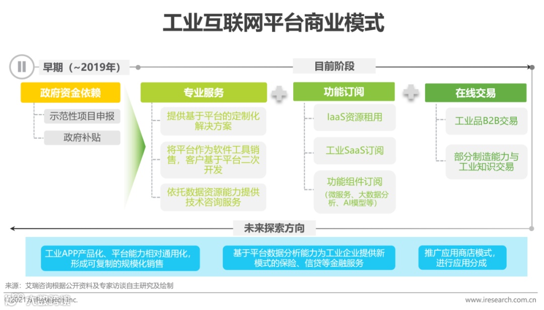 作为国家战略级的新兴朝阳产业,工业互联网在网络、安全、设备改造等基础设施部署层面的商业模式较为清晰和传统,但产业核心的平台商业模式还在不断摸索与丰富,尚未形成定局。部分消费互联网平台经济模式也出现在了工业互联网之中,但后者To B/G企业服务的色彩相当浓重,传统工业场景的多元化和复杂性也决定了工业互联网平台的商业价值主要集中于个性化服务,整体上碎片化需求与规模化供给矛盾突出,未来向通用化、可复制的标准化产品和服务延伸仍将是行业拓展商业价值关键路径之一。