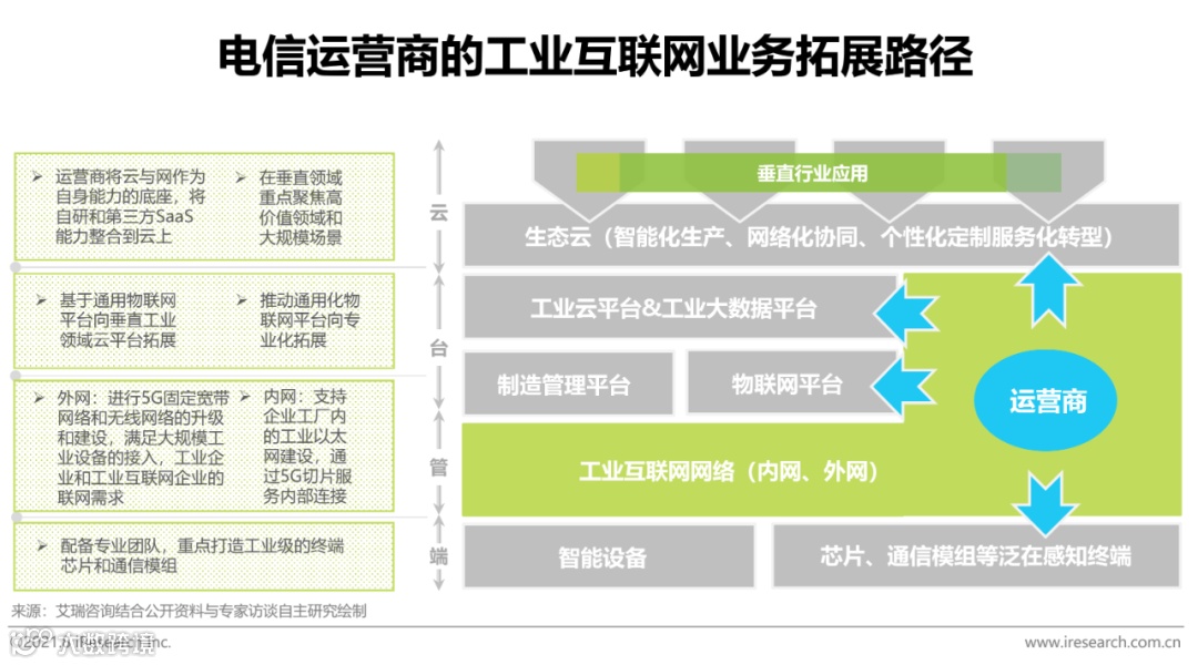 现阶段,我国工业领域网络的性能尚无法高效满足工业数字化、智能化发展的需要,工厂内网改造和外网络建设将成为未来一个阶段工业互联网行业发展的重点领域之一。作为工业互联网的“连接提供者”,电信运营商以5G网络建设为契机,基于自身资源和能力优势从“端—管—台—云”四个方面向工业互联网行业进行切入。在消费互联网时代,电信运营商与网络承载的内容失之交臂,而在当前工业互联网刚刚起步的阶段,运营商对成为产业客户数字化转型使能者势在必得。国内三大运营商均持续加码工业互联网投入力度,打造各自的5G+工业互联网解决方案,根据工信部最新数据显示,目前全国工业企业建设“5G+工业互联网”项目超过1500个,已覆盖22个国民经济重要行业。