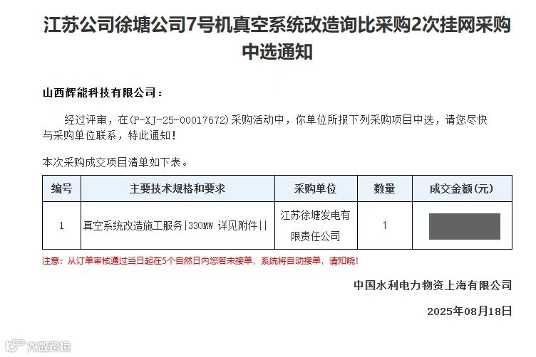 近期,山西辉能科技传来重磅喜讯,公司凭借在高效真空节能领域的技术沉淀、创新成果及市场信誉,在大唐江苏徐塘电厂高效真空节能改造项目的激烈竞争中脱颖而出,成功拿下项目。