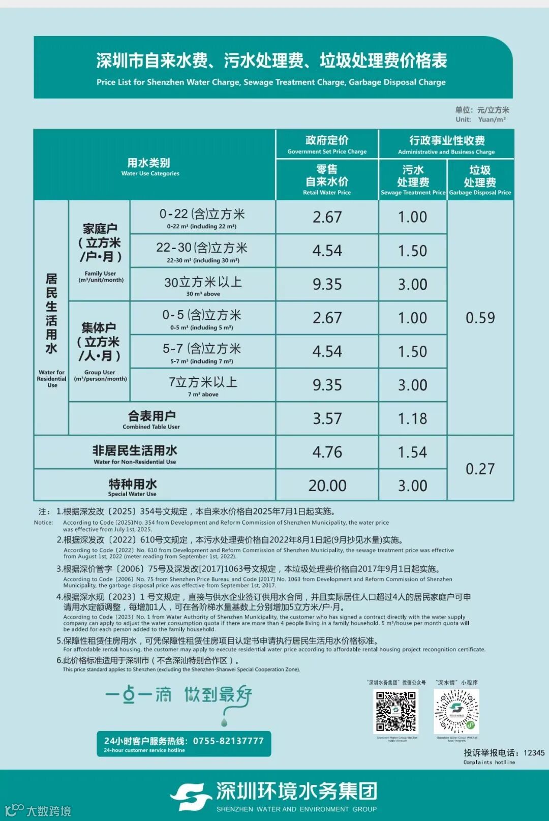 深圳市自来水费、污水处理费、垃圾处理费价格表