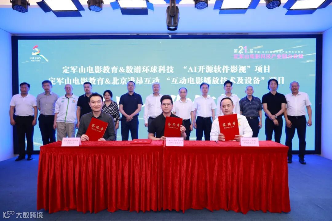 在开幕式现场,在现场领导和嘉宾的共同见证下,定军山电影教育科技(深圳)有限公司与数谱环球(深圳)科技有限公司就《AI开源软件影视》项目进行合作签约;定军山电影教育科技(深圳)有限公司与北京进昂互动科技有限公司就《互动电影播放技术及设备》项目进行合作签约;定军山电影公园(深圳)有限公司与爱威尔星空(北京)技术有限公司就《XR虚拟现实电影院》项目进行合作签约。
