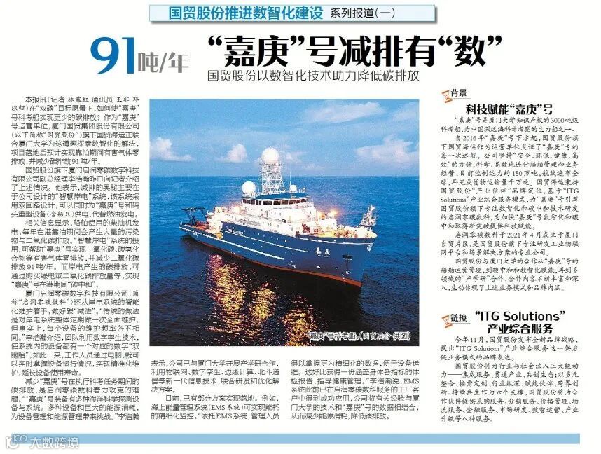 在“双碳”目标愿景下,如何使“嘉庚”号科考船实现更少的碳排放?作为“嘉庚”号运营单位,厦门国贸集团股份有限公司(以下简称“国贸股份”)旗下国贸海运正联合厦门大学为这道题探索数智化的解法,项目落地后预计实现靠泊期间有害气体零排放,并减少碳排放91吨/年。